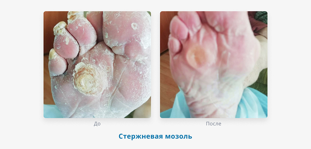 В ходе обследования выяснилось, что у нее стержневая мозоль. Одного сеанса было достаточно, чтобы удалить многолетнюю стержневую мозоль. Пациентка вышла из кабинета с легкой походкой, без хромоты и привычной боли!