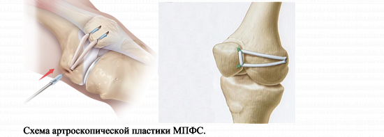 Сначала под контролем эновидеокамеры совершаются два прокола. Они позволяют провести визуальный осмотр всех отделов сустава, при необходимости хирургически обработать поврежденные участки хряща. Затем, через два новых прокола, проводится и фиксируется сухожильный трансплантат, заменяющий утраченную поддерживающую связку надколенника. Натяжение связки регулируется под контролем видеокамеры так, чтобы вывести надколенник из положения подвывиха, но оставить физиологически достаточную свободу его смещения.