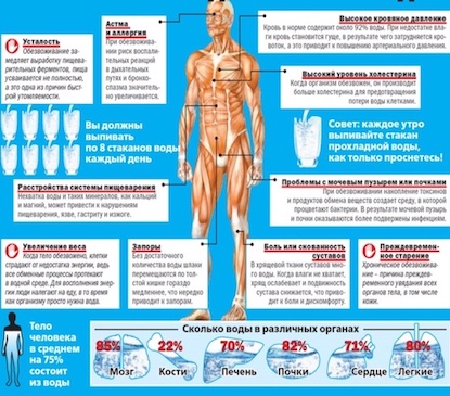 Есть один маленький нюанс, который следовало бы указать: 30 мл на кг идеального веса! Иначе такие объемы жидкости, особенно при наличии ХСН, сердечной недостаточности, могут вызвать стойкий отек ног, рук, лица, падение уровня натрия ниже 13, как следствие, появление тошноты и неясности сознания, а еще перепады артериального давления, лимфостаз, особенно при наследственной предрасположенности.