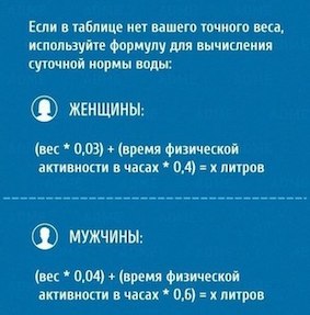 Поэтому считаем на кг идеального веса, эти таблицы есть везде: при росте 165 см и весе 85 кг, идеальный вес - 60 кг, следовательно потребность в жидкости получается - 1,8 л, а не 2,55 л.