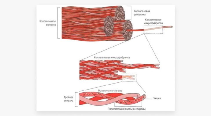 Среди протеогликанов доминирует богатый лецитином декорин. Над аморфным веществом преобладают волокна, представленные коллагеном 1 типа (95%) и коллагеном 3 типа (5%). Коллаген 1 типа обладает малой растяжимостью и высокой механической прочностью на разрыв. Коллаген 3 типа определяет диаметр сухожильного волокна и имеет меньшую прочность на растяжение. Все три типа коллагена характеризуются высоким содержанием аминокислот: глицина, пролина, лизина. Коллагеновые волокна собраны в пучки и образуют единую упорядоченную систему.