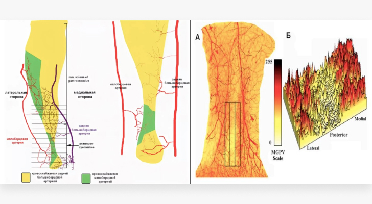При выборе доступа важно учитывать бедное кровоснабжение данной области, высокие риски краевого некроза и инфекционных осложнений. Медиальная зона, расположенная между внутренним краем ахиллова сухожилия и медиальной лодыжкой, имеет стабильный достаточный кровоток при разных положениях голеностопного сустава (обеспечивается 3-4 перфорантными артериями, диаметром от 0,9 до 1,1 мм., которые кровоснабжают и паратенон с медиальной стороны). Эта зона оптимальна для доступа.