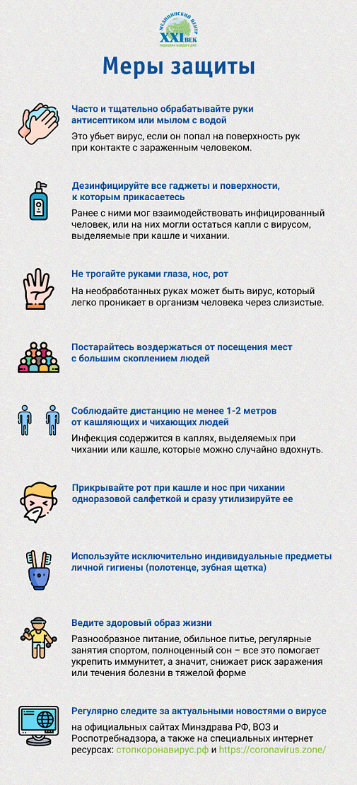 Сохраняйте спокойствие, берегите здоровье и следите за актуальной информацией на официальных ресурсах: сайтах Минздрава РФ, ВОЗ и Роспотребнадзора, а также на специальных интернет ресурсах: стопкоронавирус.рф.