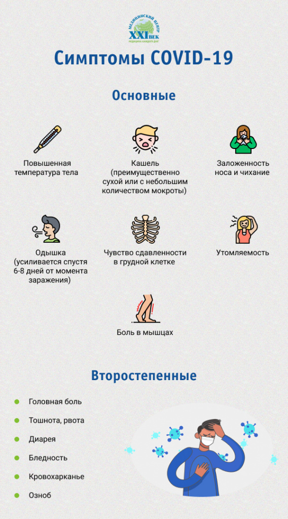 Инкубационный период инфекции составляет от 2 до 14 дней. Первое время симптомы COVID-19 могут быть слабо выражены. Основная опасность заключается в том, что клинические проявления болезни во многом схожи с обычной простудой или гриппом, из-за чего у человека снижается бдительность, и он не придает особого значения происходящему.