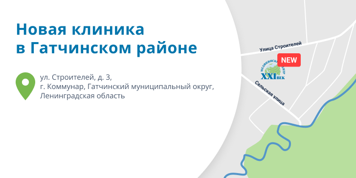 Новая клиника располагается по адресу: Ленинградская область, Гатчинский муниципальный округ, г. Коммунар, ул. Строителей, д. 3.