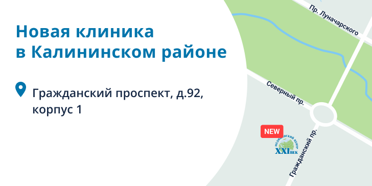 Новая клиника располагается по адресу: Гражданский проспект, д. 92, корпус 1.